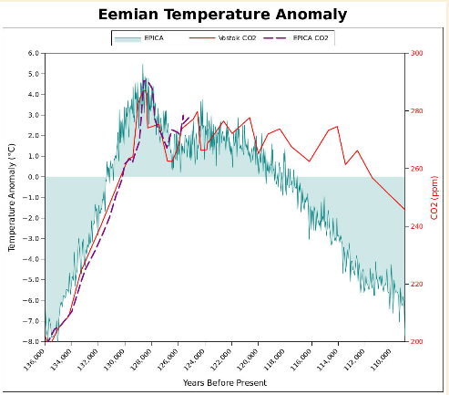 Troubling to the CO2 Theory of climate change, Kehr shows that interglacials start when temperatures and CO2 levels are low, and soon after peak temperature of the Eemian, temperatures started to fall, yet CO2 levels were hardly affected for 15,000 years, over half the time duration of the Eemian.