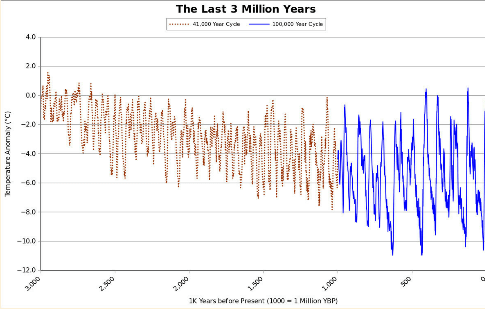 Paraphrasing Kehr, “Glacial cycles the past 2.6 million years took place on two different time scales. During the initial period, cycles took ~41,000 years. Using today as zero temperature anomaly, the temperature range of Earth during the 41,000-year cycles was from -6C to 0C. Cycles behaved that way from the start of the current ice age until a million years ago.