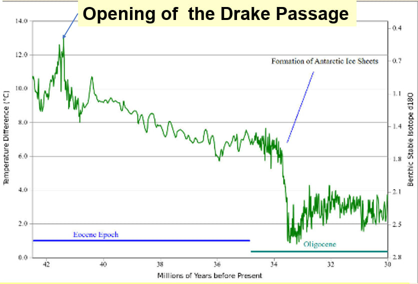 Some of this material is shown in the meeting graphics, Slides 29-31, link above. Opening Drake Passage triggered cooling of Antarctica because warm, moderating influences of tropical and subtropical ocean waters was no longer anywhere adjacent to Antarctica. The fall in global temperatures caused changeover from Eocene Epoch to Oligocene ~35 million years ago.