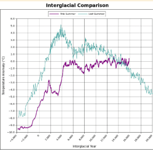 Using the EPICA ice cores to characterize this interglacial, the Holocene, and the previous interglacial, the Eemian, which peaked 129,000 YBP, Kehr uses the analogy “this summer vs. last summer” to compare the two interglacials.