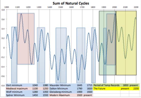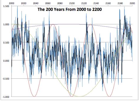 The next graphic shows a plot of the sum of all three curves. The period is from 1000 AD until 2200 AD so it includes the thermometer record of recent time.
