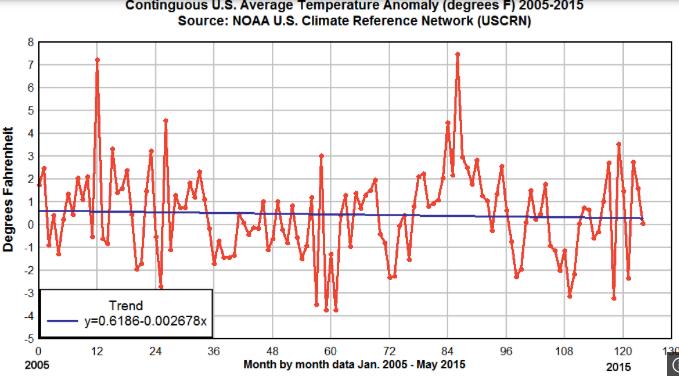 Since this data set was only available from January 2005 until May 2015, it compliments and adds to the “flat” data record of the recent past that is shown by real satellite and balloon data in the very first graphic of this report. The USCRN is a very new system of monitoring stations and this data set is all we have right now for an extensive rural US climate network. This is not a global record but it certainly indicates that at least the rural sites in the continental US plus Alaska and Hawaii are not following any sort of global warming trend (with no chance of an Urban Heat Island –UHI- effect). In fact if you look closely, the trendline has a slight negative tilt.