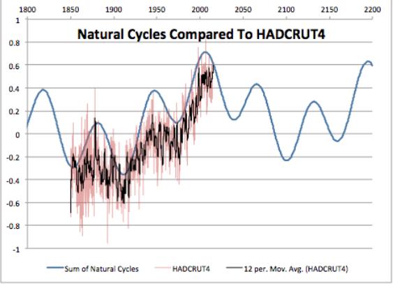 This is one person’s effort using a well known 60-year temperature pattern that is natural and has been cycling this way for 100s of years. So far, the HadCRUT data set is mostly bounded by his model envelop. The bright blue and red excursions are what we call weather but this climate model over the past 130 years is on track to be a completely valid if very simple model.