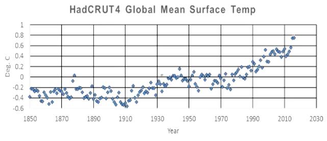 The following graphic shows a commonly used temperature dataset that goes back to 1850 produced by the UK Met Office – HADCrut.