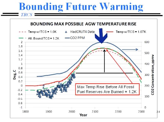 The graphic below shows a set of possibilities. The maximum temperature rise is noted to be 1.2 K before all fossil fuels known are burned up which is the bounded value of TCS.