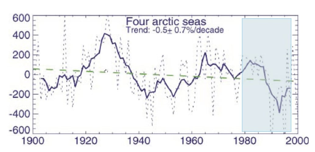 The IPCC’s First Assessment Report, sometimes FAR, was published in 1990. One of the graphs from that report is Figure 13 below. It provides more insight as to why the NCA4 authors chose 1980 as the starting point for their Arctic Ice decrease calculation.