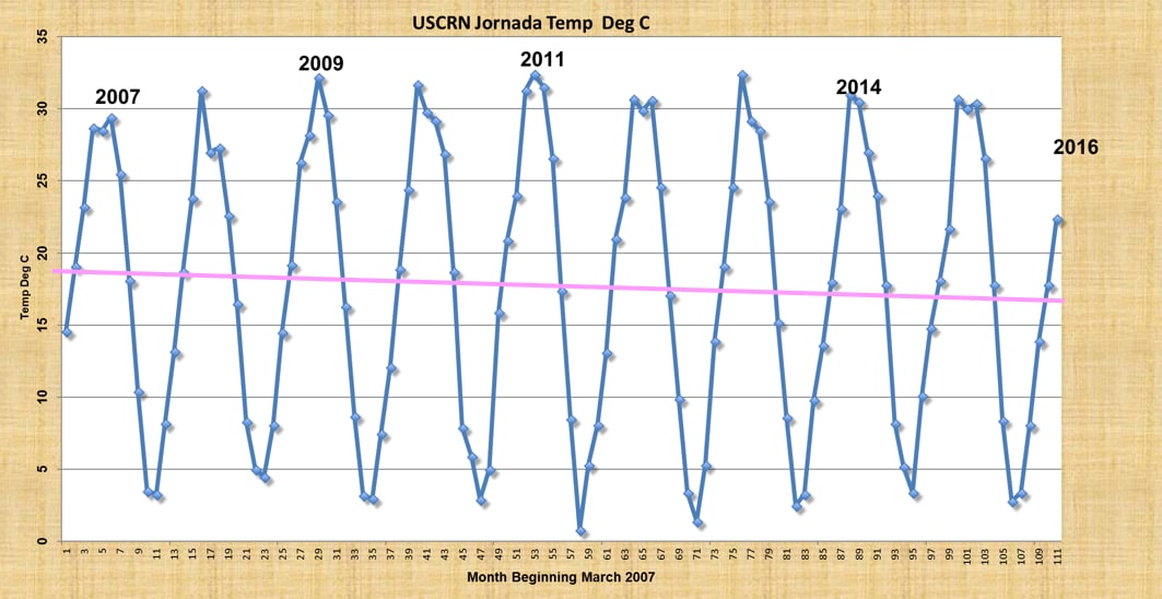 A recently-installed USCRN station on Jornada Range shows temperatures falling 3F since 2007.