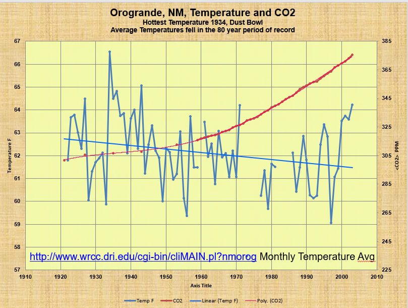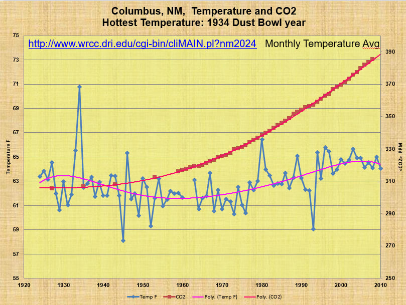 Western Regional Climate Center records for Columbus and Orogrande show maximum temperatures occurred during the dust bowl years, as do those for Cimarron and Santa Rosa, while Tucumcari’s peaked in 1918.
