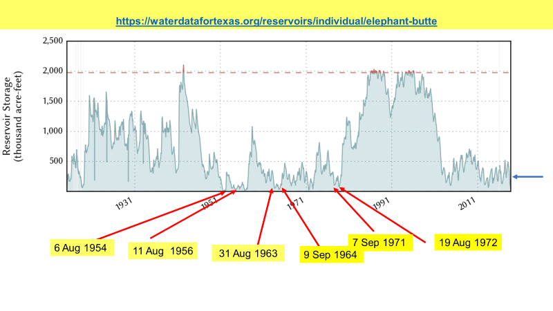 Paskus’ sense of alarm with recent Elephant Butte Reservoir capacity falling to 3% implies impending catastrophe, but historic data show frequent episodes where the reservoir capacity in the 1950s, 60s and 70s fell below 1%, as low as 0.1%, on 6 August 1954. Put another way, the recent capacity was 22 TIMES MORE than the low reached in 1954. We know our rainfall and snowfall here are controlled by El Nino and La Nina. Data show a 60-year period of increased El Ninos and rainfall, with more La Ninas and drought in between. This is the Pacific Decadal Oscillation, the PDO.