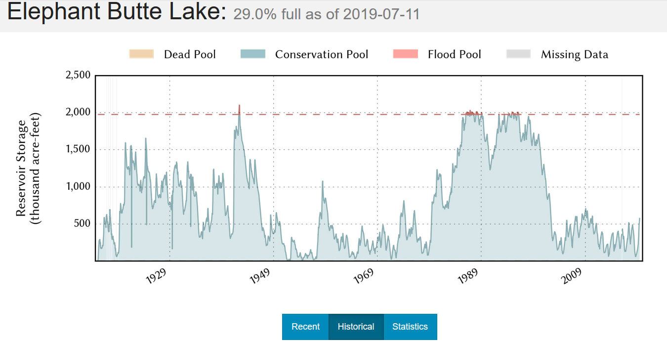 I mentioned Elephant Butte Reservoir was the largest body of water in New Mexico; its impounded waters are shared among Texas, New Mexico, and Mexico. Water is released from the reservoir beginning in the spring, to flow down the Rio Grande to water users. Below is a plot of the water levels in Elephant Butte Lake as of 11 July 2019.