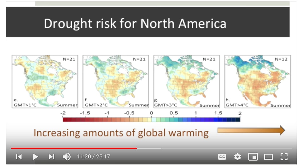 I presented my analysis of Hayhoe at our 16 Feb 2019 meeting of the Cruces Atmospheric Sciences Forum. Besides ignoring the inconvenient thousand-year cycles, another of her deliberate distortions is that computer forecasts are a worthwhile, valid, and undisputable resource to determine future conditions. Examples of her forecasts from her presentation at NMSU are shown below. The Hayhoe graphics are screen captures from the above link; each gives the time of the segment.