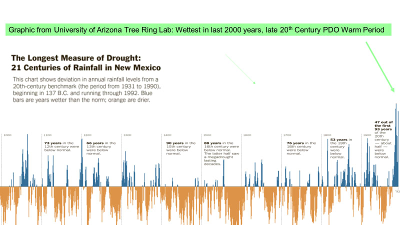 Observations in the Mountain West have repeatedly demonstrated the wild naturally-occurring climate fluctuations within the recent past which are brought about by rapid changes from El Nino to La Nina conditions as ocean temperatures change offshore western North America. In 1954, the droughts were so severe that New Mexico’s largest water body, Elephant Butte Reservoir, went down to 0.1 percent of capacity; that event was measured on 6 August 1954.