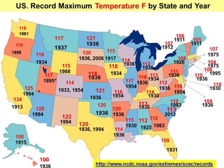 That a Lecture on Climate and Climate Change would not mention the most severe drought episode in the nation’s history, the Dust Bowl Years of the 1930s, shown by the bunched-up orange bars from 1931-1940 in the PDSI chart above, during which many to most of the 50 states Extreme Maximum Temperature Records were set, map below, is disappointing.