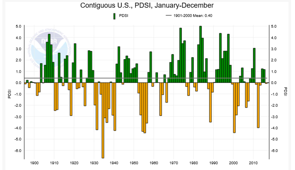 My studies of meteorology and climate have been punctuated with discovery of numerous multi-year weather events and cycles: El Nino’s formal name is El Nino Southern Oscillation; the term oscillation brings to mind a cyclical pattern. The Pacific Decadal Oscillation, some 60-years in length has a precipitation and drought pattern which makes the present droughts seem one 60-year cycle past the 1950s droughts so common in the USA, as this plot of the Palmer Drought Severity Index, PDSI, of the USA seems to show: