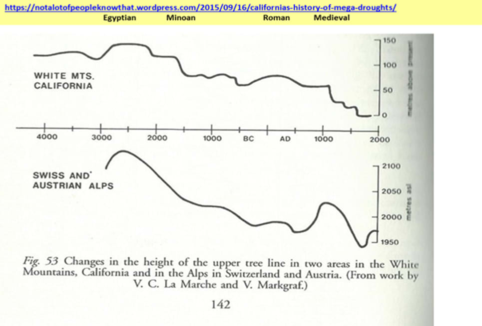 My graphic above, showing the higher tree lines in California the past 6000 years is from Hubert Lamb’s book, Climate, History, and the Modern World, page 142.