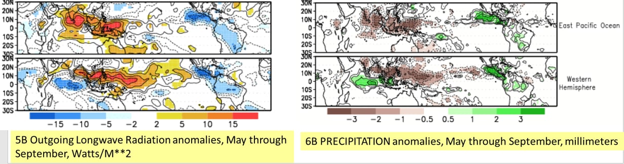 Figure 13, below, shows for the East Pacific and Western Hemisphere, MJO Phases Seven and Eight, Outgoing Longwave Radiation anomalies left and MJO precipitation enhancements, right for the 25-year period, 1979-2004, for northern hemisphere summer.