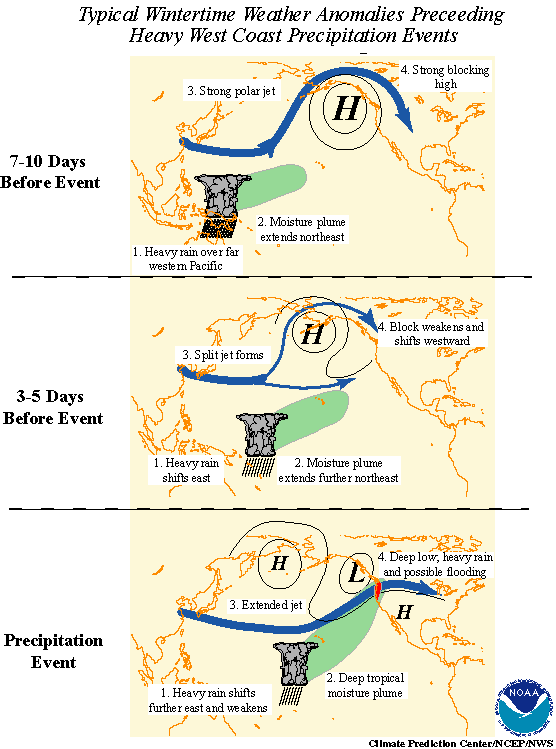Figure 11. Sequence of events for development of a Pineapple Express event along the west coast of the USA. The sequence starts over a week ahead, with a strong high in the Gulf of Alaska, and heavy precipitation in the western Pacific. Three to five days before the event, in the westerlies, the Gulf of Alaska high retrogrades into an “Omega Block” in the Aleutians, split flow in the jet stream develops in the west-central Pacific, north of Midway Island, and in the tropics, movement of the heavy rain and deep tropical moisture flow east, to the central Pacific. The Pineapple Express event has the blocking high retrograded to the westernmost Aleutian Islands, a strong low has replaced it in the Gulf of Alaska, and the strong flow of tropical moisture flows southwest to northeast, from Hawaii to the Pacific coast.