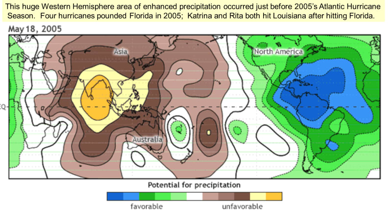 “Huge” and “Massive” are the first words to describe these areas of suppressed and enhanced precipitation which occurred in the 18 May 2005 MJO Phase 8 event, the Western Hemisphere, shown in Figure 10 below. Resembling a huge egg yolk covering parts of India, Bangladesh, Burma and Thailand, the suppressed area of precipitation extends from the Aral Sea to Australia and Japan to the Horn of Africa. The enhanced precipitation area extends from the Outer Banks of North Carolina almost to the coast of west Africa, tropical South America, all Central America and the Yucatan.