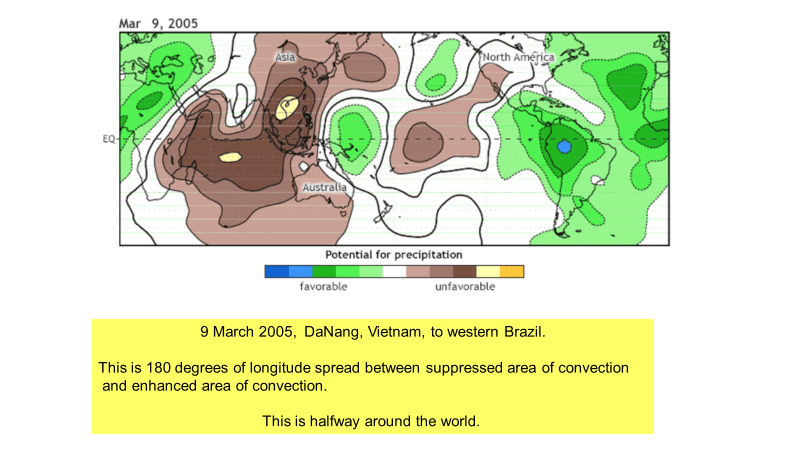 Figure 7, below, shows an extreme spread which occurred during a Western Hemisphere or Phase 8 example of the MJO, centered on 9 March 2005.There are 180 degrees of longitude between the suppressed phase, near DaNang, Vietnam, and the enhanced phase, in western Brazil.