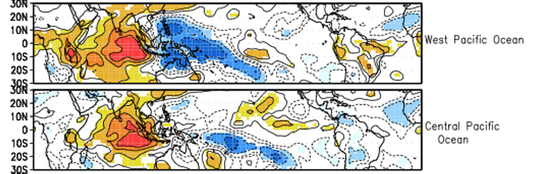 Figure 5: Two visualizations of an MJO area of enhanced precipitation, in blue, as it progresses eastward from the Western Pacific to the Central Pacific. The blues represent areas where radiation to space is from the cold cloud tops of tropical precipitation systems. The oranges and reds indicate areas of less cloudiness; the warm tropical sea surfaces radiate directly to space, since there is almost no cloud cover. Most of this activity is in the Southern Hemisphere from the Equator to 15S.