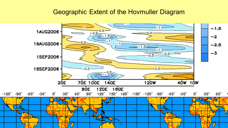 Figure 4. The Hovmöller diagram showing the areas of enhanced and suppressed Outgoing Longwave Radiation juxtaposed with an enhanced or almost doubled Mercator Projection of Earth’s surface. Note well the wide longitudinal extent of the Madden-Julian Oscillation as revealed with this diagram.
