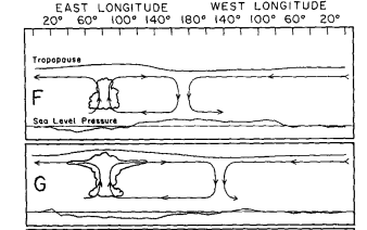 Figure 1. From a schematic of the MJO from a 1994 survey article by Madden and Julian. The top section, “F,” shows the enhanced tropopause heights, enhanced convection, warmer temperatures, and ascending air in front of the precipitation area. The “G” section shows lower sea level pressures associated with the area of enhanced precipitation, and, well out in front, the area of higher sea level pressure and subsiding air.