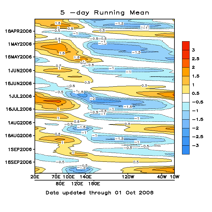 Figure 5 below shows two charts illustrating the eastward progression of an MJO area of enhanced precipitation as revealed from satellite observation of the Outgoing Longwave Radiation. Negative Values of OLR (Blue colors) indicate the enhanced convection area, more cloud cover, and the cooler cloud tops radiating less longwave radiation to space