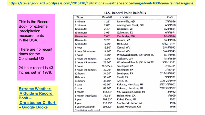 Just a glance at the US Government’s own data (Figure 6) shows that any claim that sixteen inches in two days is somehow a record is faulty or fraudulent. It is nowhere near the record of 22 inches in 2.75 hours set at D’Hanis, Texas in 1935 or the 43 inches at Alvin, Texas in 24 hours in 1979.
