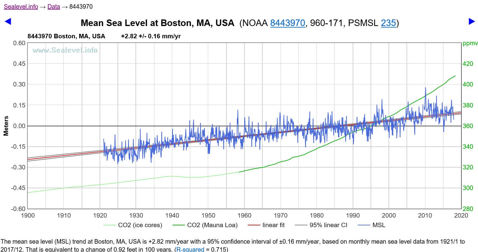 Indeed, had EPA attorneys been competent, and had they presented appropriate sea level data and other real-world evidence during trial and on appeal, the Supreme Court could have examined data like that from National Oceanic and Atmospheric Administration’s (NOAA’s) tide gage in Boston harbor. As Figure 8 illustrates, the rate of sea level rise is essentially unchanged over the past century and longer, even as CO2 levels climbed, then accelerated, in their rate of increase, especially since the 1960s.
