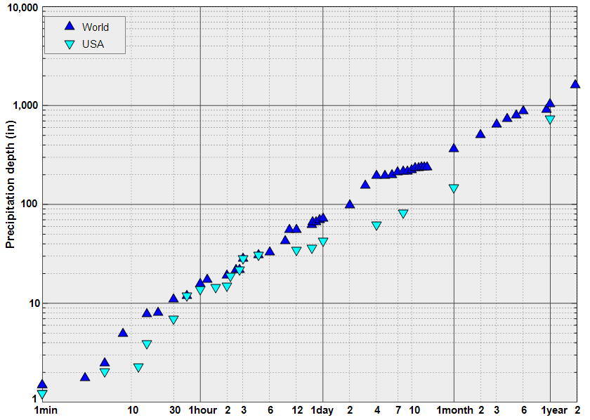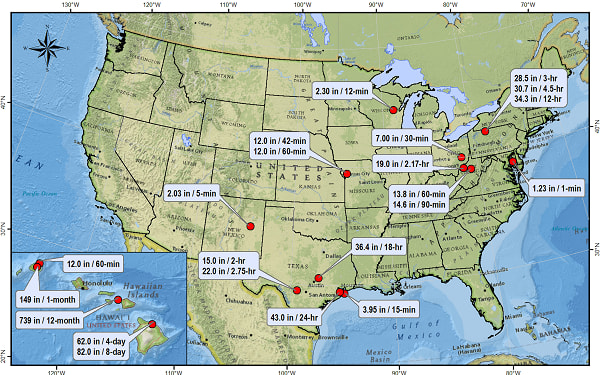 Just a few minutes of internet searching will uncover substantial data on extreme rainfall events in the USA. Some are displayed below in Figure 5.