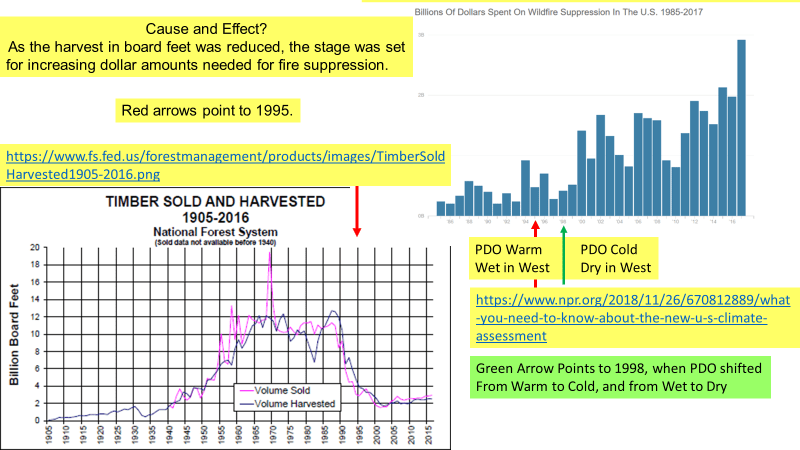 As Figure 1 summarizes, the Northern Spotted Owl decision resulted in a precipitous decline in the amount of timber harvested and sold, resulting in widespread unemployment – and massive fuel load increases in the forests. Mere years later, about 1998, the Pacific Decadal Oscillation mode shifted from Warm (wet in the west) to Cold (dry in the west) and the dollars spent on fires shot as high as the flames, as US Forest Service and National Public Radio data affirm.