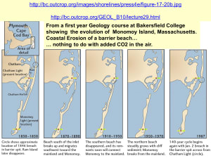 Figure 3, from a Bakersfield College geology course, shows the evolution of Monomoy Island, Massachusetts, over the last two centuries. Without even getting into what this area might have looked like 12,000 years ago, just before the last Pleistocene glaciers began to retreat and the Atlantic Ocean was some 400 feet shallower than it is today, it is obvious that Monomoy has been anything but stable.