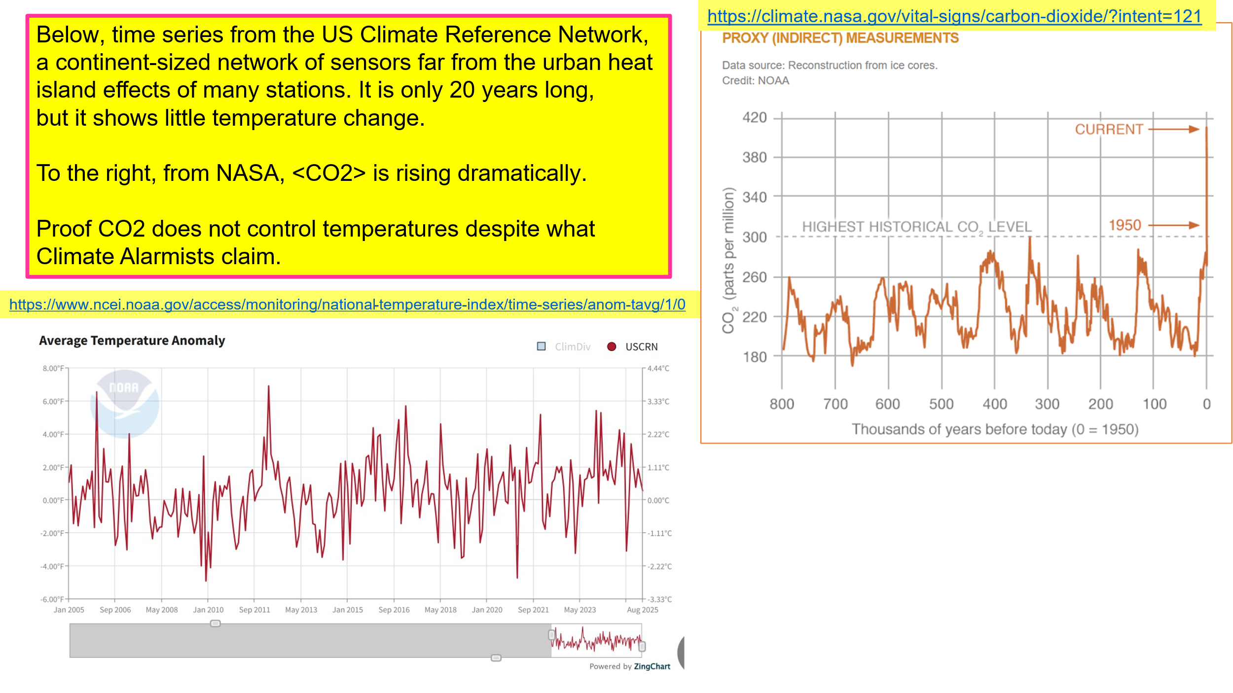 Below is Figure 10, showing on the left a plot of surface temperatures from NOAA, the United States Climate Reference Network, USCRN, for the 20-year period 2005-2025. On the right is a time series of Carbon Dioxide Concentrations from NASA, showing a dramatic increase in <CO2> over the past 100-200 years. The dramatic increases in CO2 have not influenced the surface temperatures recorded from the USCRN.