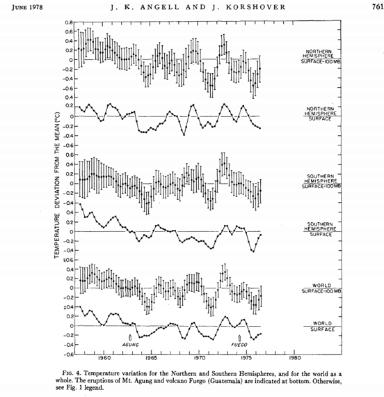 From the technical literature of the post WW2 economic boom period, in Monthly Weather Review, “Global Temperature Variation, Surface-100 mb, An Update into 1977,” by Angell, J. K. and J. Korshover, Vol. 106, No. 6, June 1978: their Figure 4 Time Series from 1955-1975 show decreasing temperatures at the Surface in the Northern Hemisphere, Southern Hemisphere, and Globally. Their same Figure 4 displays more time series over the same dates, 1955-1975, all of which show a distinct drop in temperatures at the surface, and at numerous levels aloft, to 100 mb, about 53,000 ft.