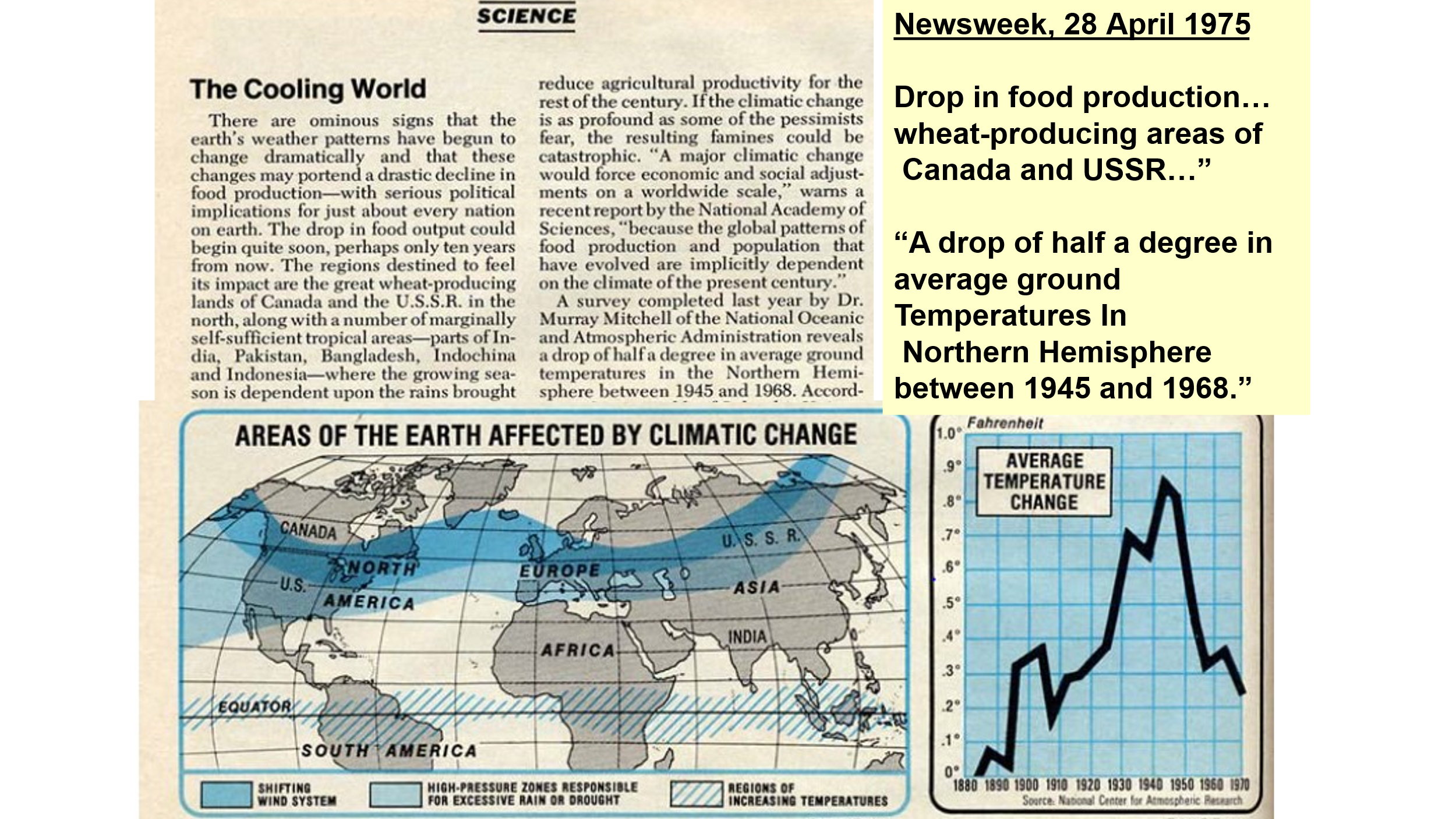 NEWSWEEK, 28 Apr 1975, in the SCIENCE section: “The Cooling World;” an image capture is in Figure 3, below. Some quotes:
