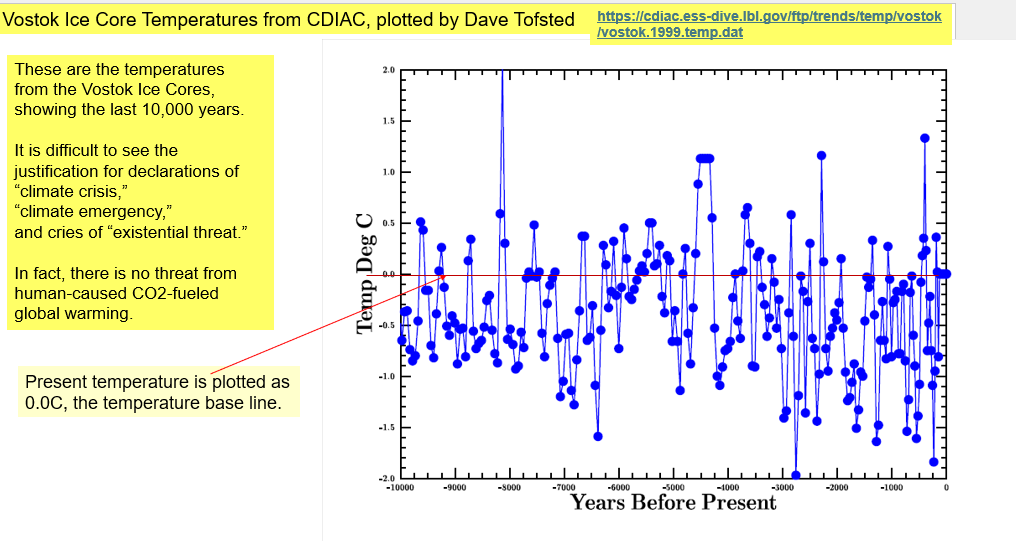 Again, Ice Core reconstructions of temperature from the Vostok Ice Cores show numerous fluctuations of +/- 1.5C; there are no reasons to think the present increase in temperature from the depth of the Little Ice Age two centuries ago is in any way leading to the climate catastrophe proclaimed by the climate alarmist community.