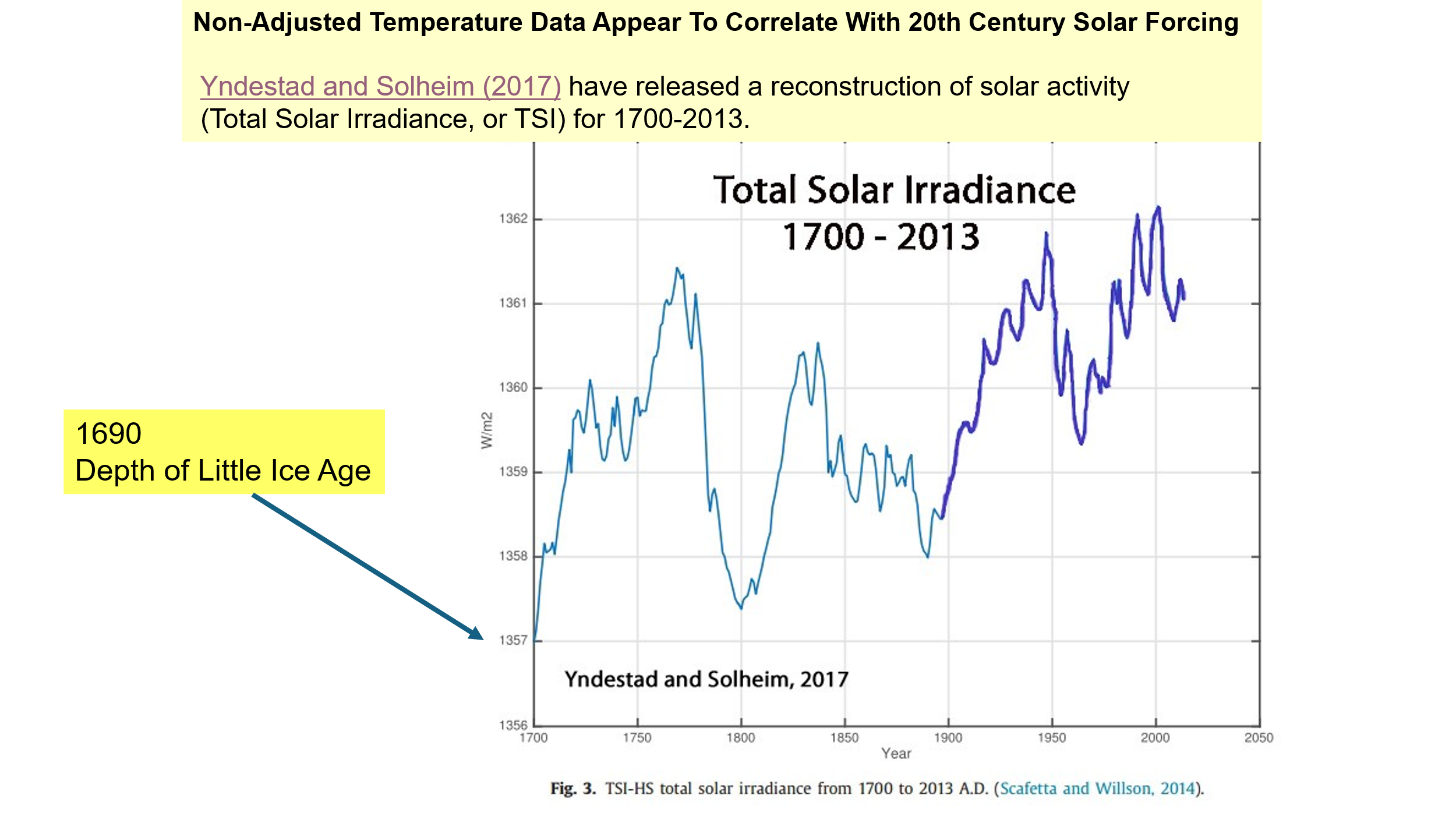 From New Astronomy, consider the 1 Aug 2016 journal article by Yndestad, Harald, and J.E. Solheim. Their plot of Total Solar Irradiance, TSI, 1700-2023, is just below.