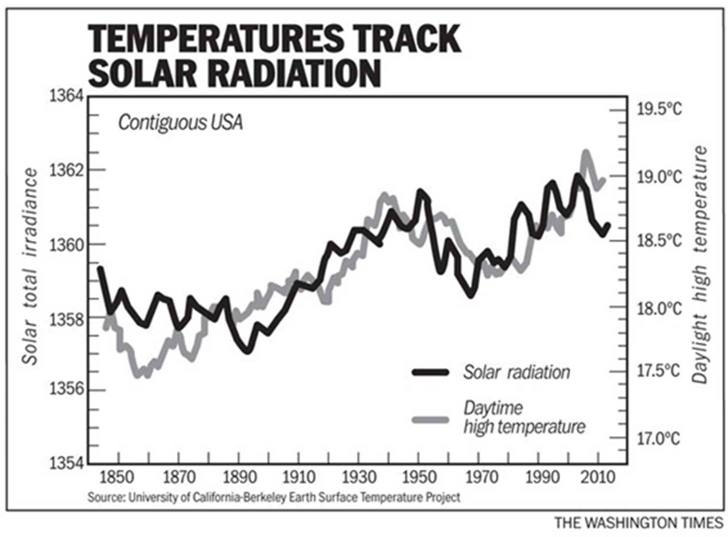 A close-up of the period 1845-2013 is in Soon, W. in Figure 7, below, showing TSI in Black, and the Berkeley Earth Surface Temperatures in Gray. The message from the data clearly is, “Earth Temperature changes are caused by changes in Total Solar Irradiance, TSI.”