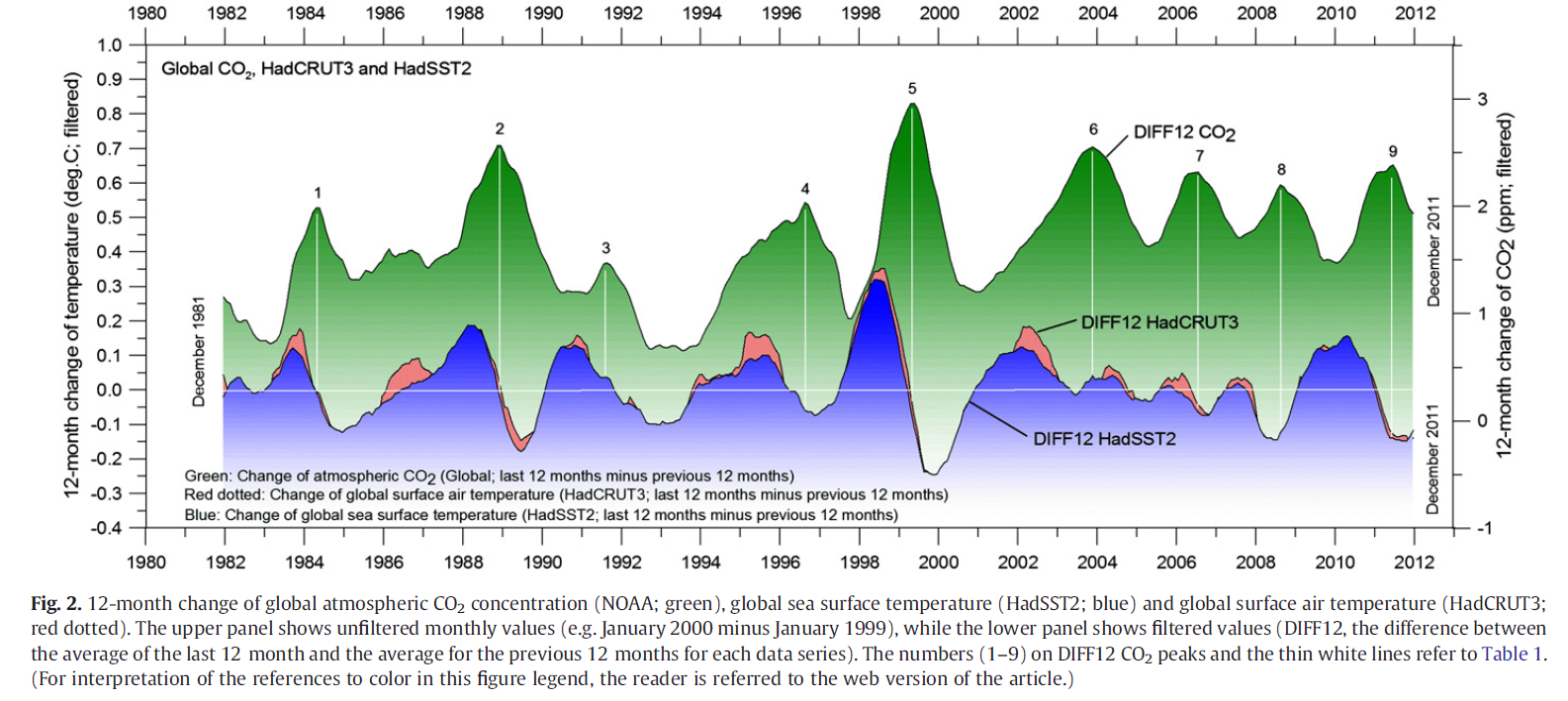 Several publications demonstrate that as sea water warms, FIRST the sea water temperature increases, THEN the atmospheric <CO2> increases. This is seen In Humlum, et al, “The phase relation between atmospheric carbon dioxide and global temperature.” Figure 8, below, shows this feature, where time progresses from left to right. Note Well: FIRST the sea water temperature (blue), increases, THEN the atmospheric <CO2> (green) increases. Clearly TEMPERATURE controls <CO2>. Not the reverse.