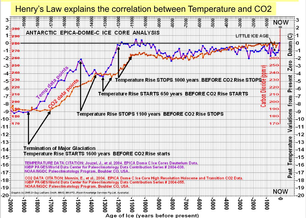 This diagram in Figure 9 shows an EPICA Dome C Ice core analysis from Antarctica, originally from The Carbon Sense Coalition. This Carbon Sense graphic plots blue dots, the time series of temperatures, and red dots, the time series of CO2 from that ice core. Time advances from left to right. From the left, FIRST the temperature changes, THEN, later, the CO2 changes. There are four separate demonstrations plotted, showing that TEMPERATURE controls <CO2>, not the reverse.