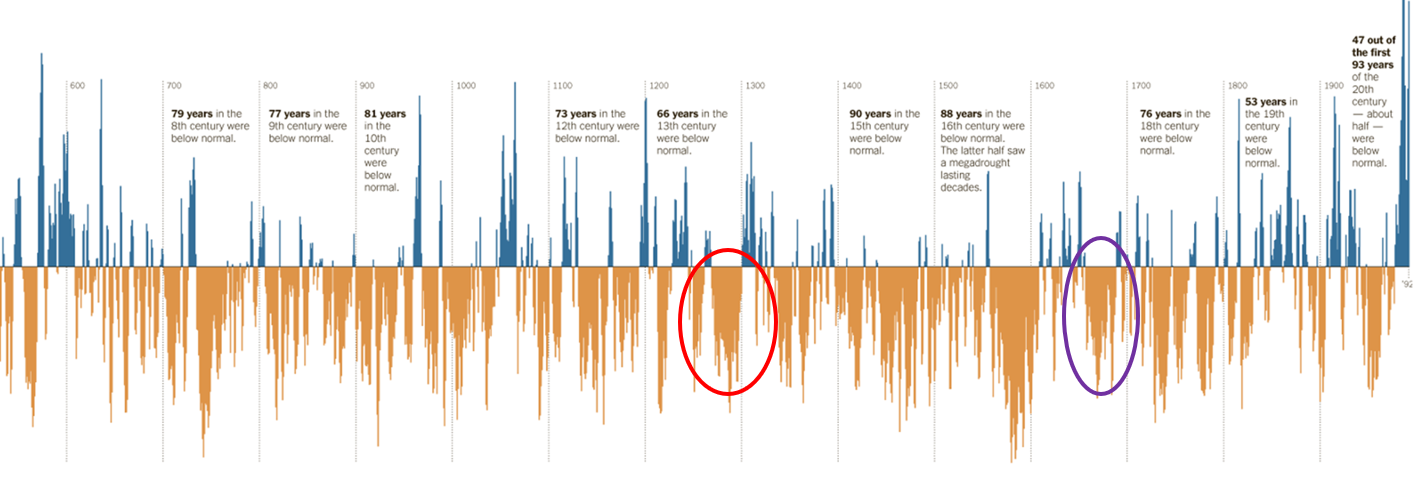 The University of Arizona Tree Ring Laboratory published a chronology of rainfall which was cited more broadly in the New York Times on 12 Aug 2012 with the title, “The Longest Measure of Drought: 21 Centuries of Rainfall in New Mexico.” A segment of that time series is Figure 2 above. These two significant drought periods are highlighted with the red and purple ovals in Figure 2.
