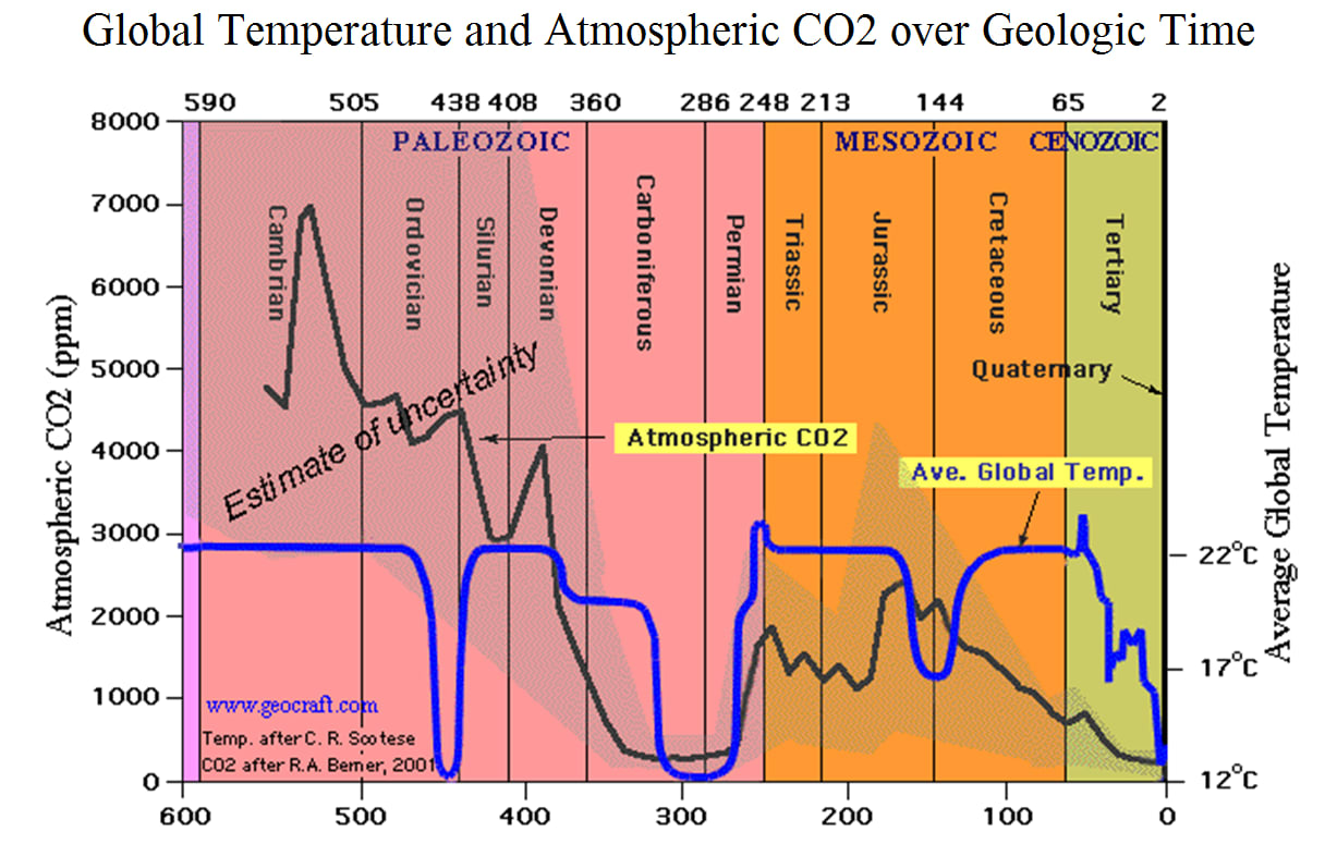 I asked him about two periods in geologic history. First was end of the Ordovician, about 450 million years ago when CO2 increased from 4000 to 4400 PPM but earth entered a “snowball earth” phase. Second was the end of the Jurassic 150 million years ago, when CO2 was increasing, but temperatures fell. He told me that the data were wrong.