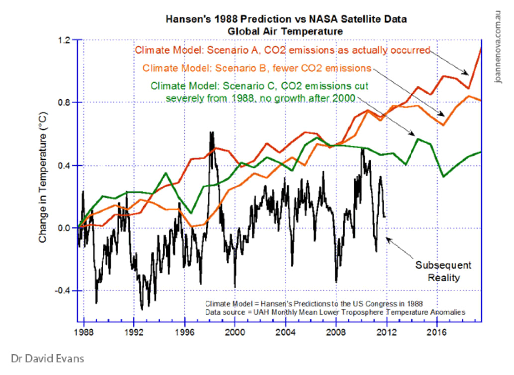Hansen’s reply wandered around, saying there were three scenarios forecast and that actually the climate forcing was less than the “Business as Usual, Scenario A.” (In the basic talk he bemoaned CO2 emissions from fossil fuel use were on an ever increasing curve; to me, a non-sequitur) He then said that temperatures had NOT decreased, despite the fact that seven of the nine commonly watched measurements of global land, sea, and greenhouse temperatures have shown falling temperatures since at least 2001 during this time of increasing CO2. He then said I should have seen his 1983 paper and the forecast he made back then!