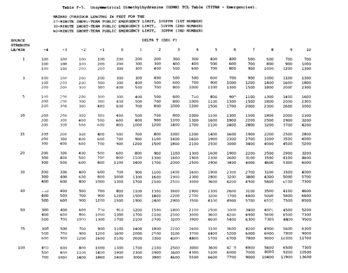 AWSP 105-57 had a series of tables of toxic corridor lengths for UDMH and N2O4, with each table having as the abscissa the(16M-2M) Delta-T (Deg F) and the ordinate, the chemical’s source strength. The number at the intersection was the distance from the point of a chemical release, downwind until it diffused down to the Short-Term Public Exposure Limit, the STPEL.