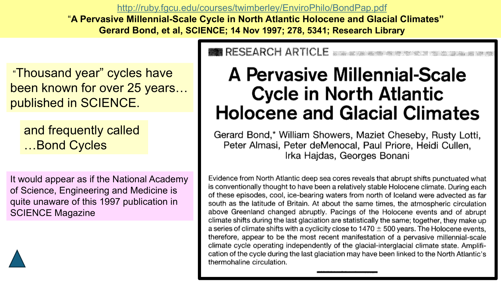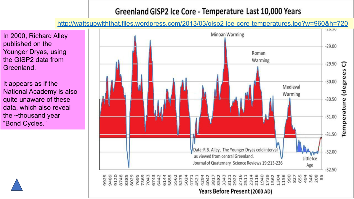 Well over twenty years passed between this publication in SCIENCE, of the existence of those pervasive millennial climate cycles, yet it seems as if the National Academy of Science was totally ignorant of the existence of such cyclic behavior of temperature and associated features of climate, such as glaciation, for example, as it exists in Greenland.