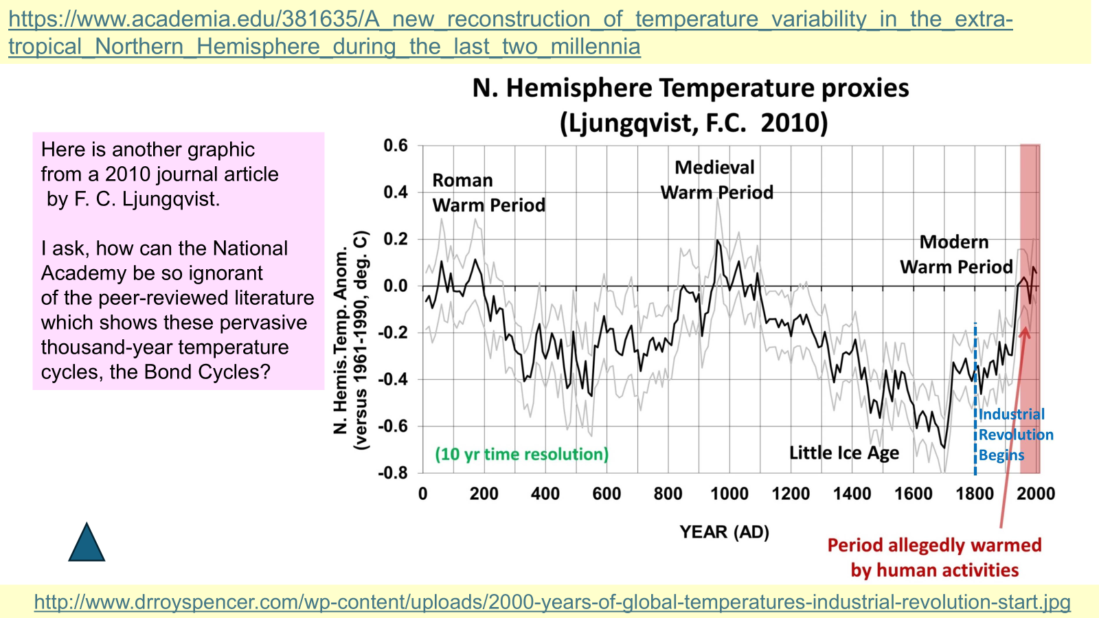The following graphics show links to the literature, and specific examples of significant temperature time series from that literature, some over thousands of years, demonstrating this. There are the “pervasive millennial-scale climate cycles” published in SCIENCE in 1997, and examples thereafter that NAS had not found when it made the claim, that I found on 16 Aug 2019, “Climate change is happening today.”